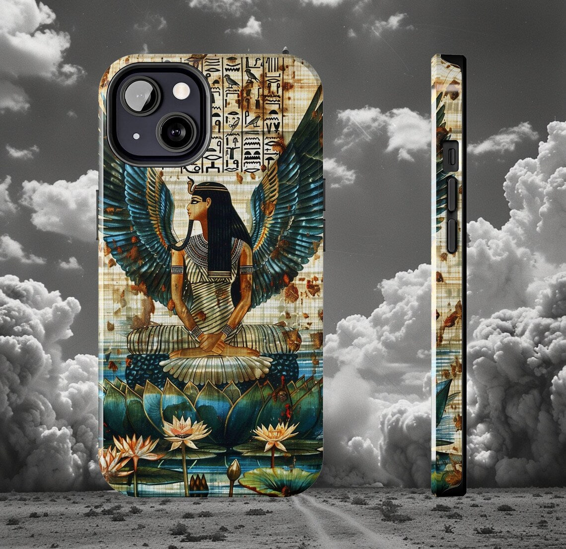 - Adorn your phone with the mystique of ancient Egypt with our 'Ancient Wings of Maat Phone Case'. This intricately designed case showcases Maat, the Egyptian goddess of truth and justice, depicted with outstretched wings in a serene lotus pond. The detailed hieroglyphs and vibrant imagery transport you back to the time of pharaohs, making this case a perfect blend of history and art