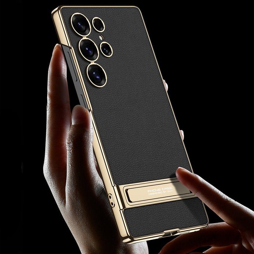 Introducing the "Electroplated Plain Leather Triumph Stand Case" for Samsung – a triumphant combination of sleek design, electroplated accents, genuine leather, and a versatile stand feature. Elevate your Samsung experience with this case that seamlessly blends style and functionality.